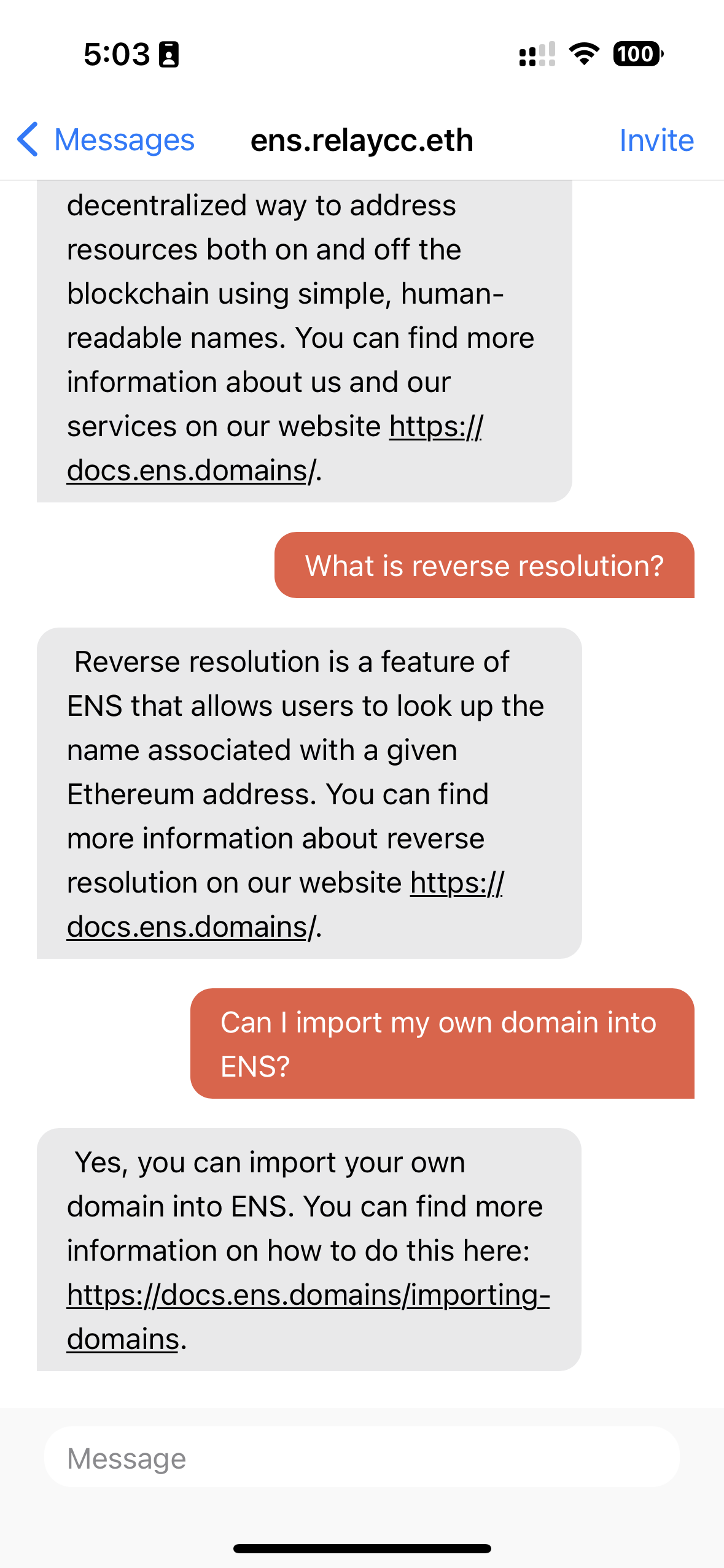 account interacting with Relay’s chatbot for ENS, ens.relaycc.eth