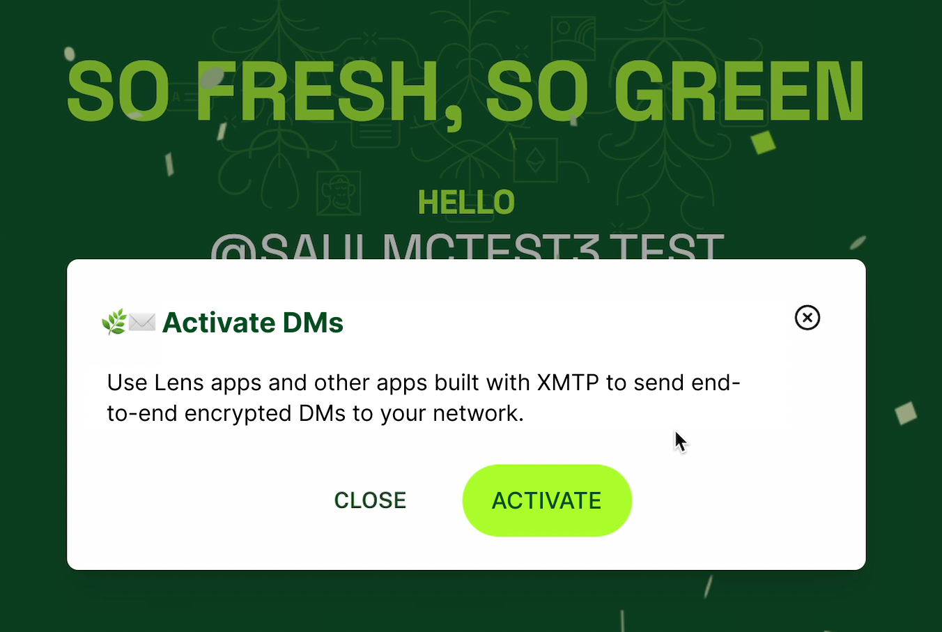 In your app onboarding flow, enable your users to activate XMTP DMs. User access to DMs can help with app engagement and re-engagement. For example, here is a prompt to activate XMTP DMs in the onboarding flow to claim a Lens handle: