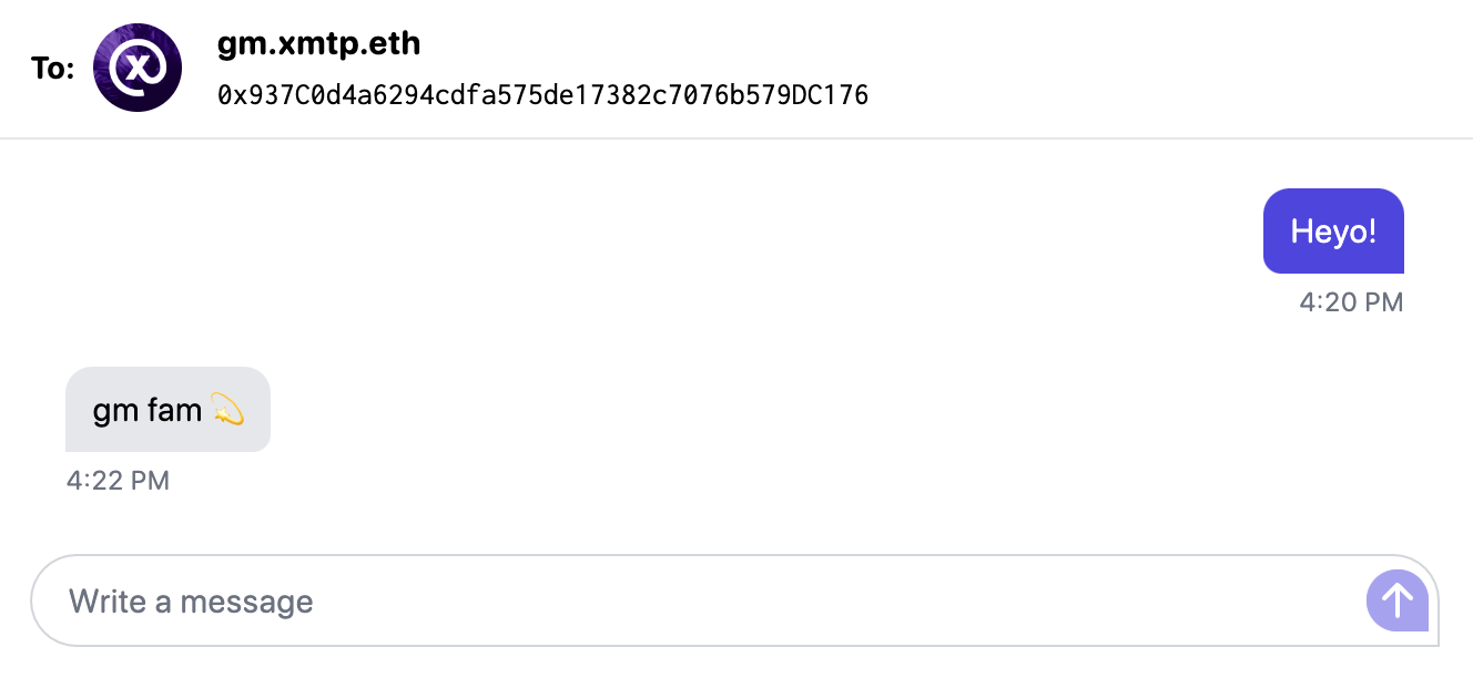 )Message this XMTP message bot to get an immediate automated reply.